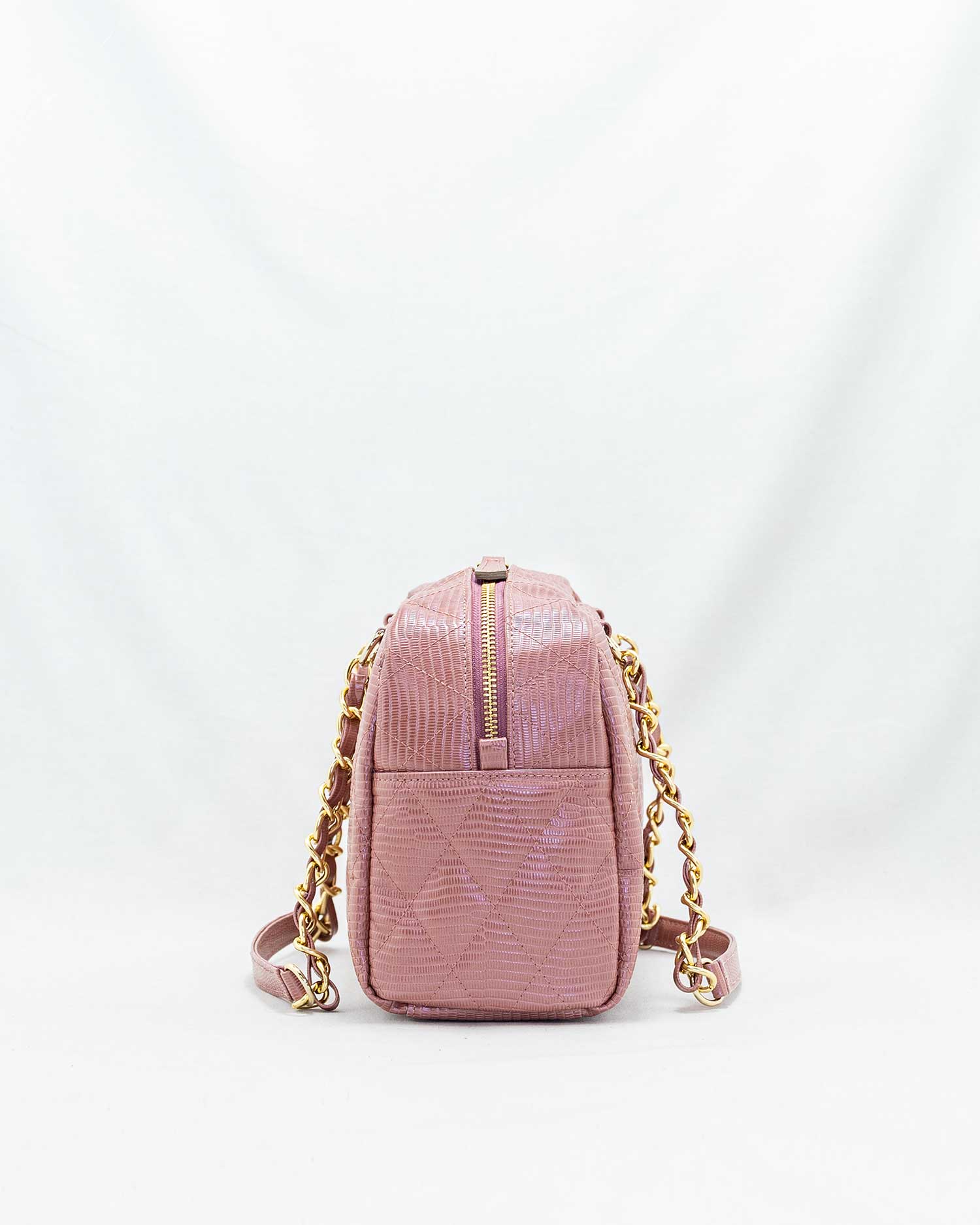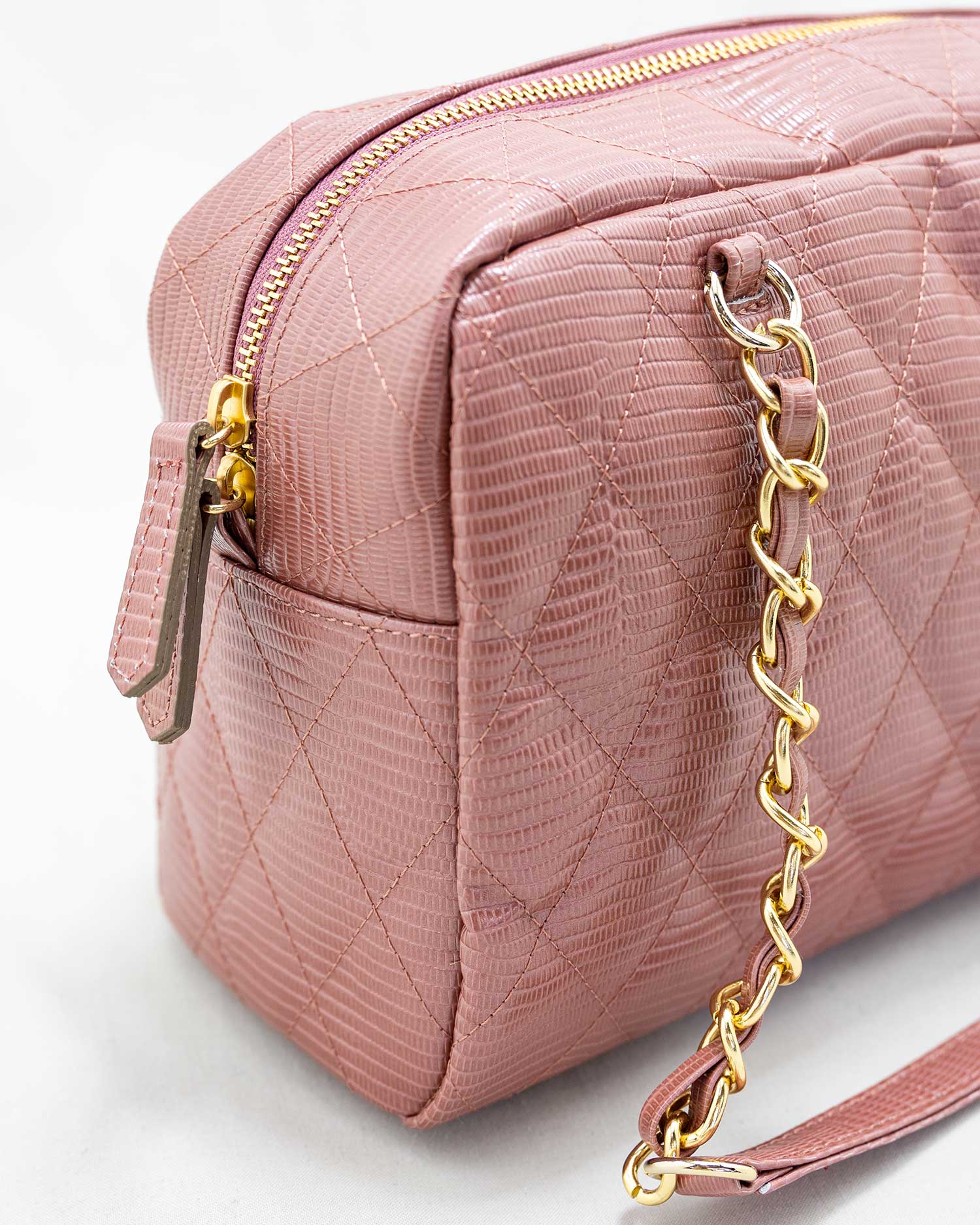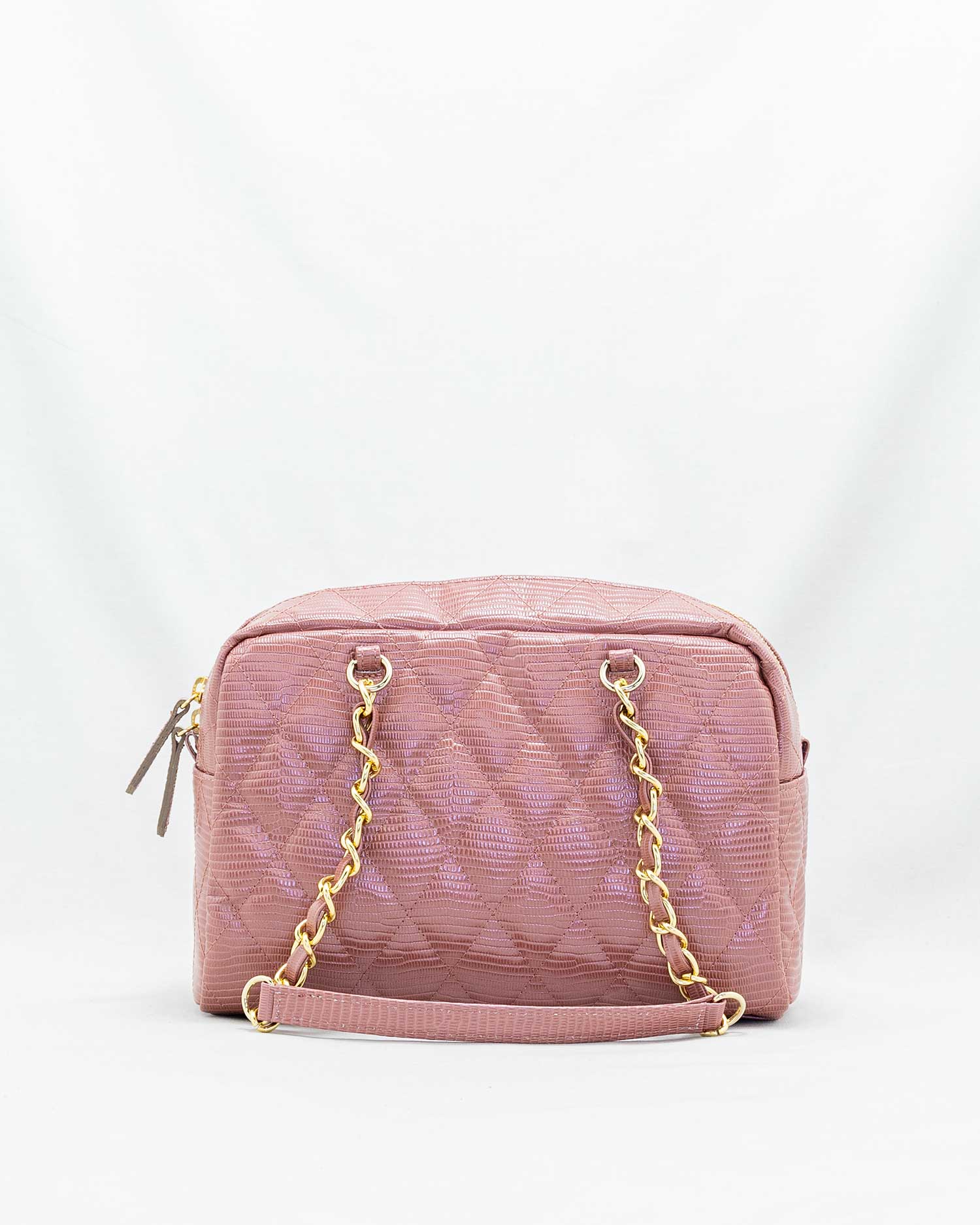 エレガントにもカジュアルにも持てて華やかさを添えてくれるチェーンバッグを、他では見られないリザード調レザーで個性を演出。牛革にリザードの細かく並んだ長方形の鱗模様を型押し、さらにキルトステッチをかけたボディは見る人の印象に残る美しさ。広めのマチ幅で収納力があり、チェーンショルダーにはレザーを配して肩からずれ落ちにくくする配慮も。