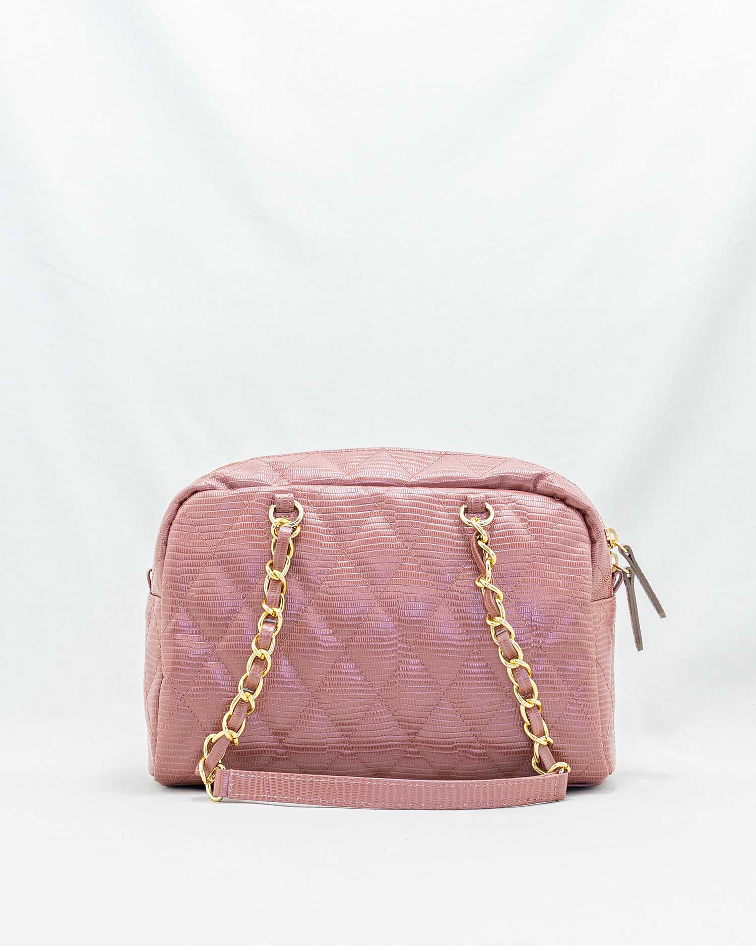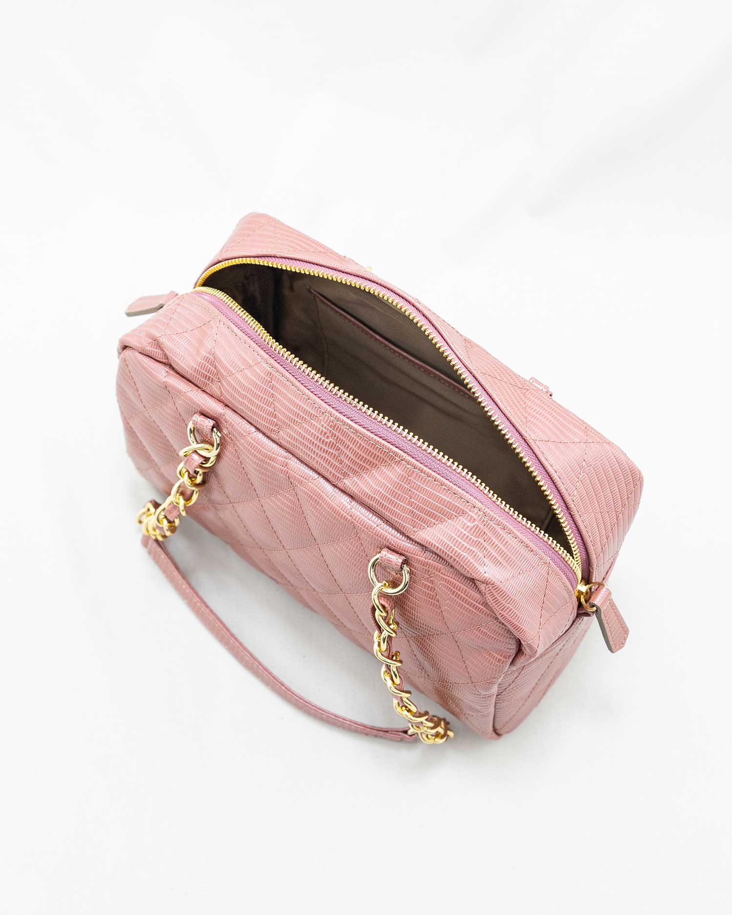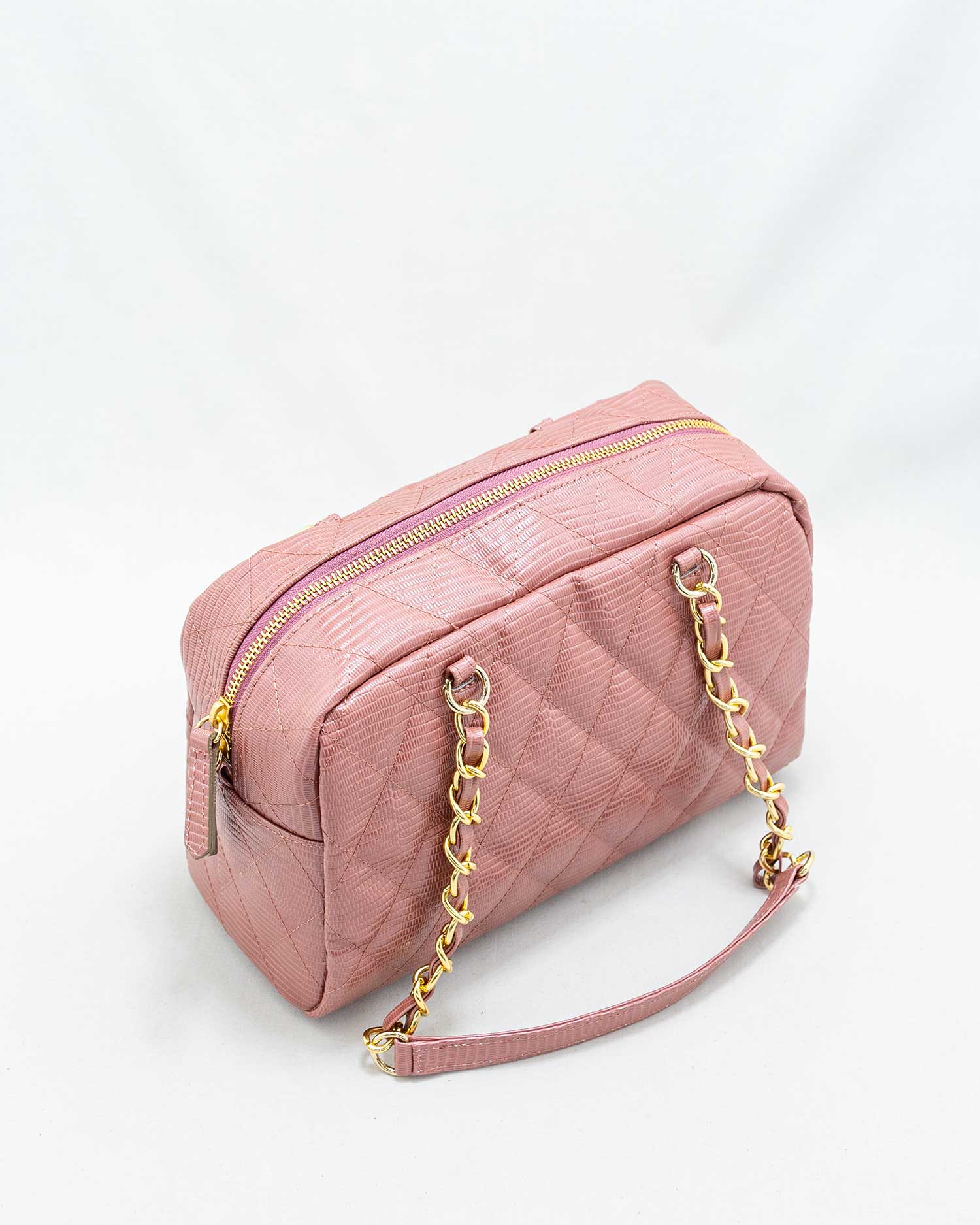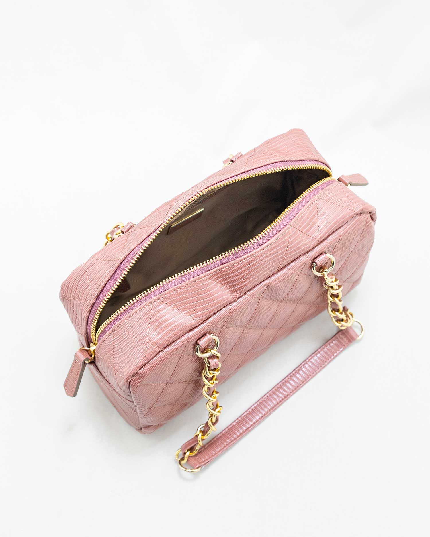 エレガントにもカジュアルにも持てて華やかさを添えてくれるチェーンバッグを、他では見られないリザード調レザーで個性を演出。牛革にリザードの細かく並んだ長方形の鱗模様を型押し、さらにキルトステッチをかけたボディは見る人の印象に残る美しさ。広めのマチ幅で収納力があり、チェーンショルダーにはレザーを配して肩からずれ落ちにくくする配慮も。