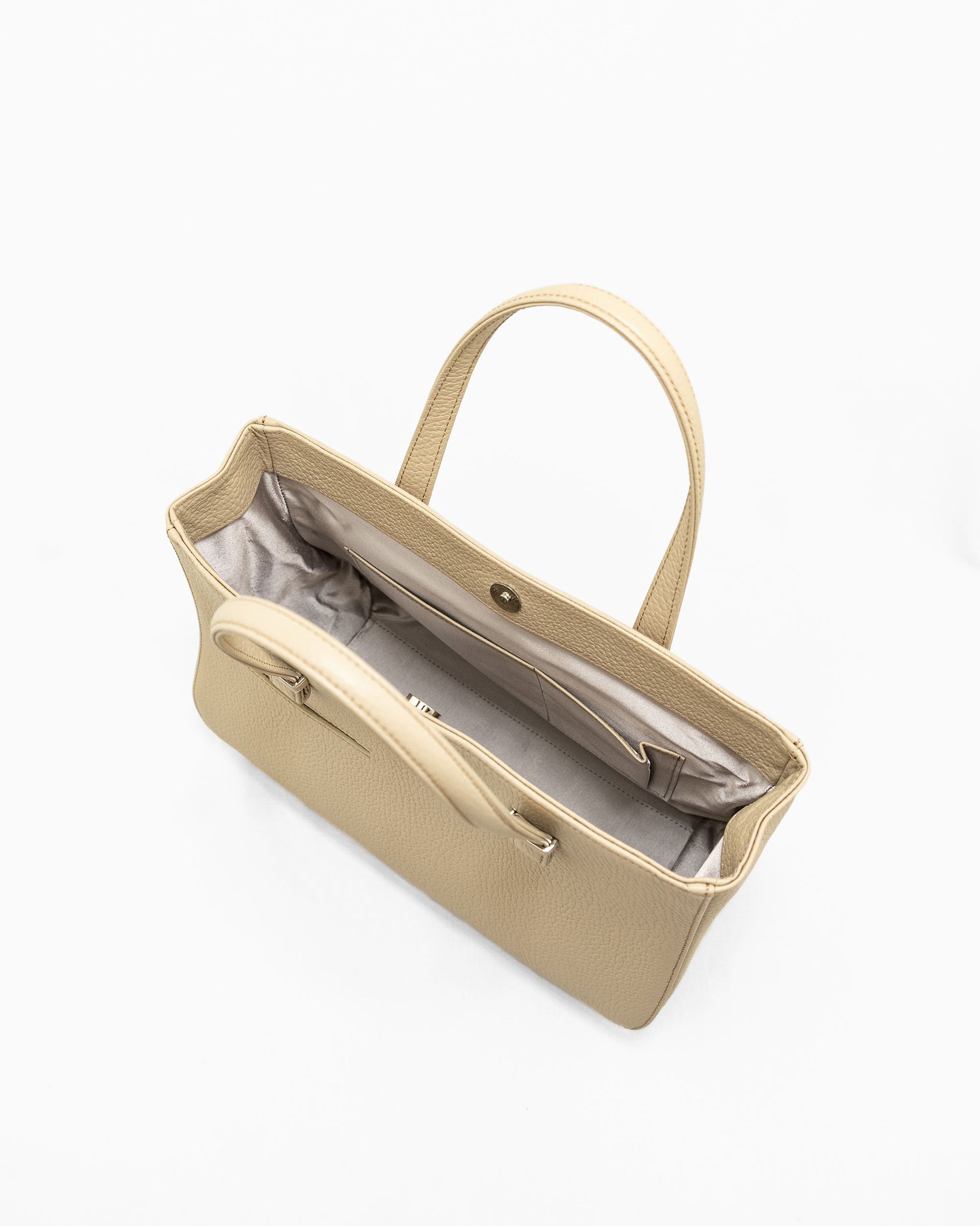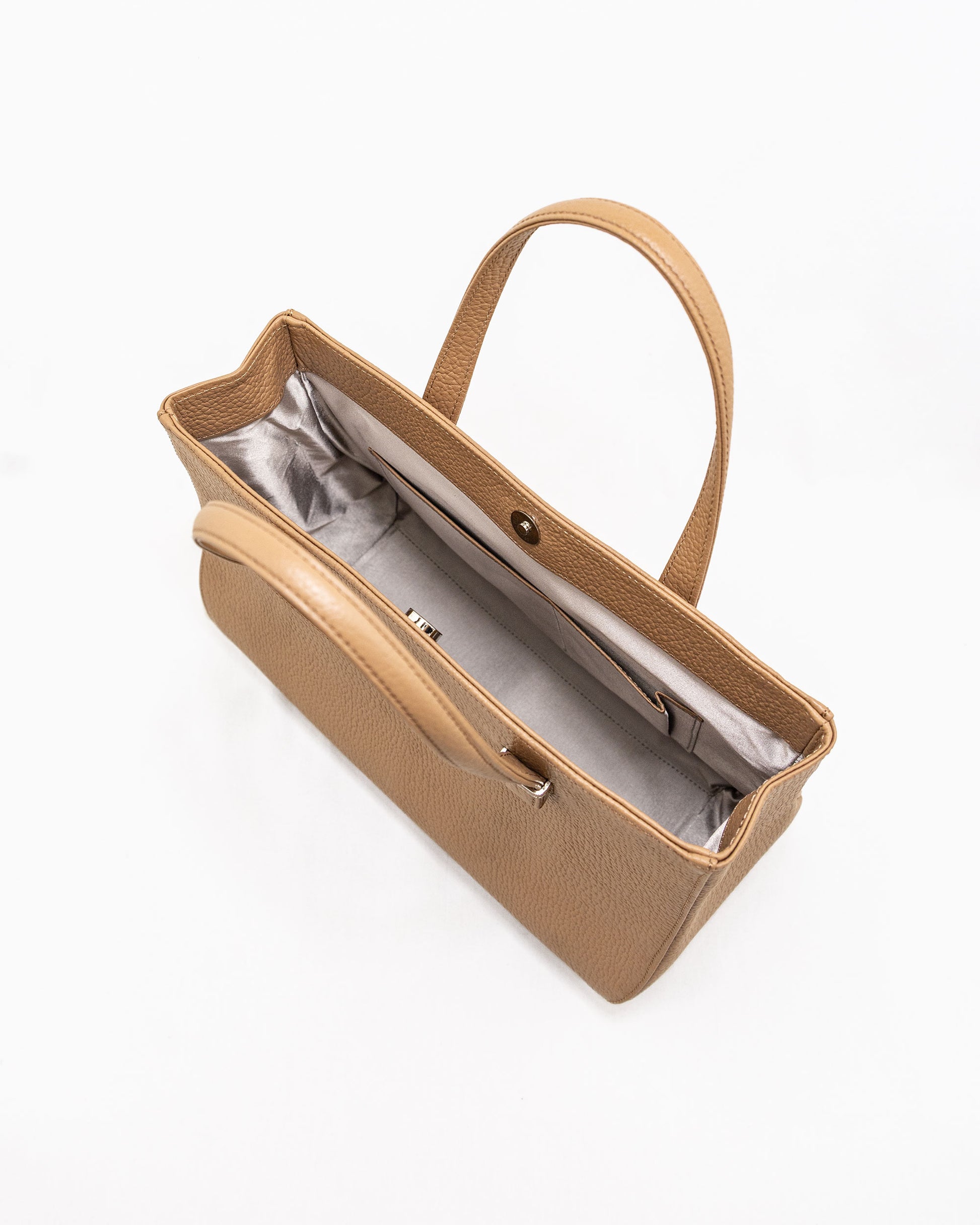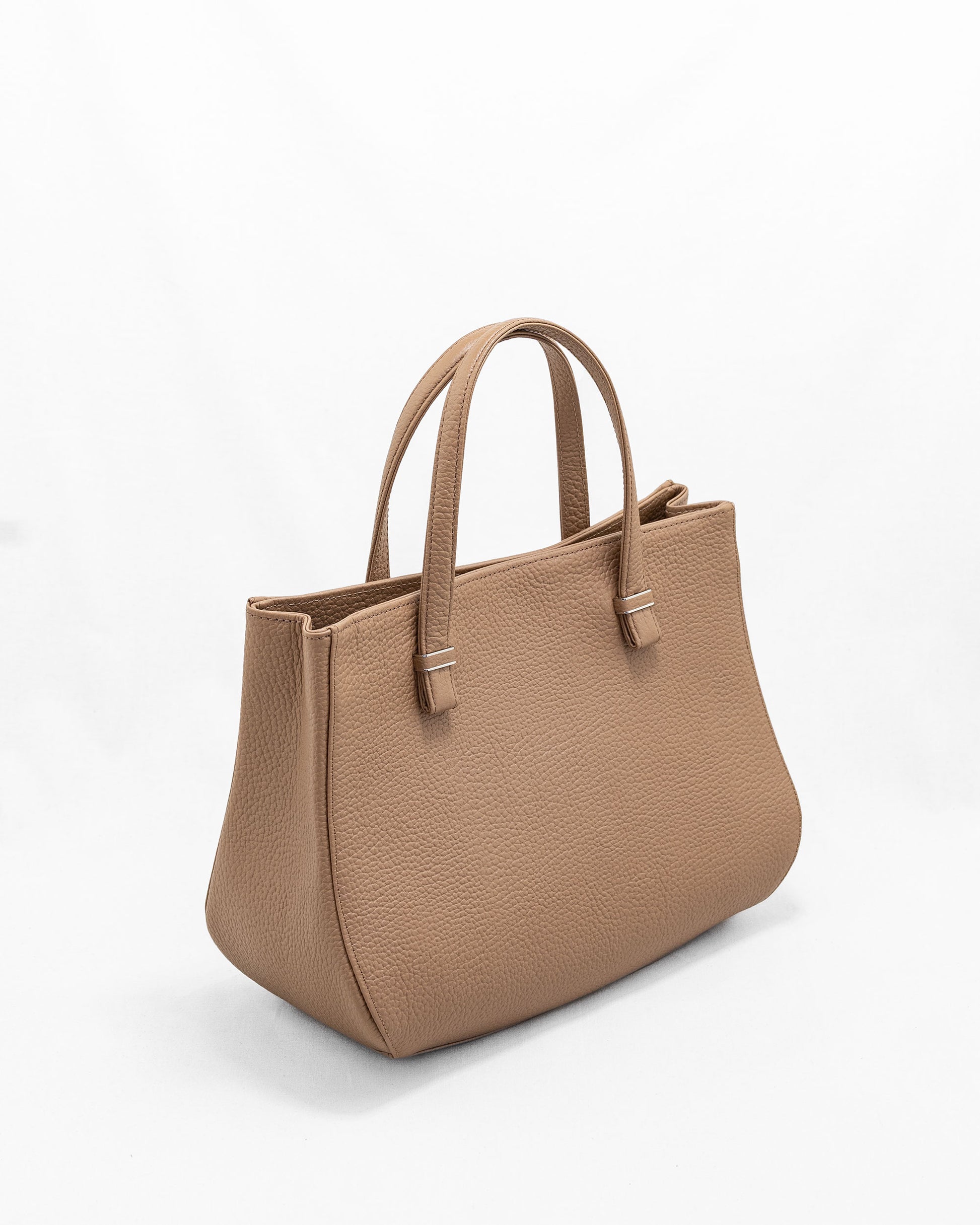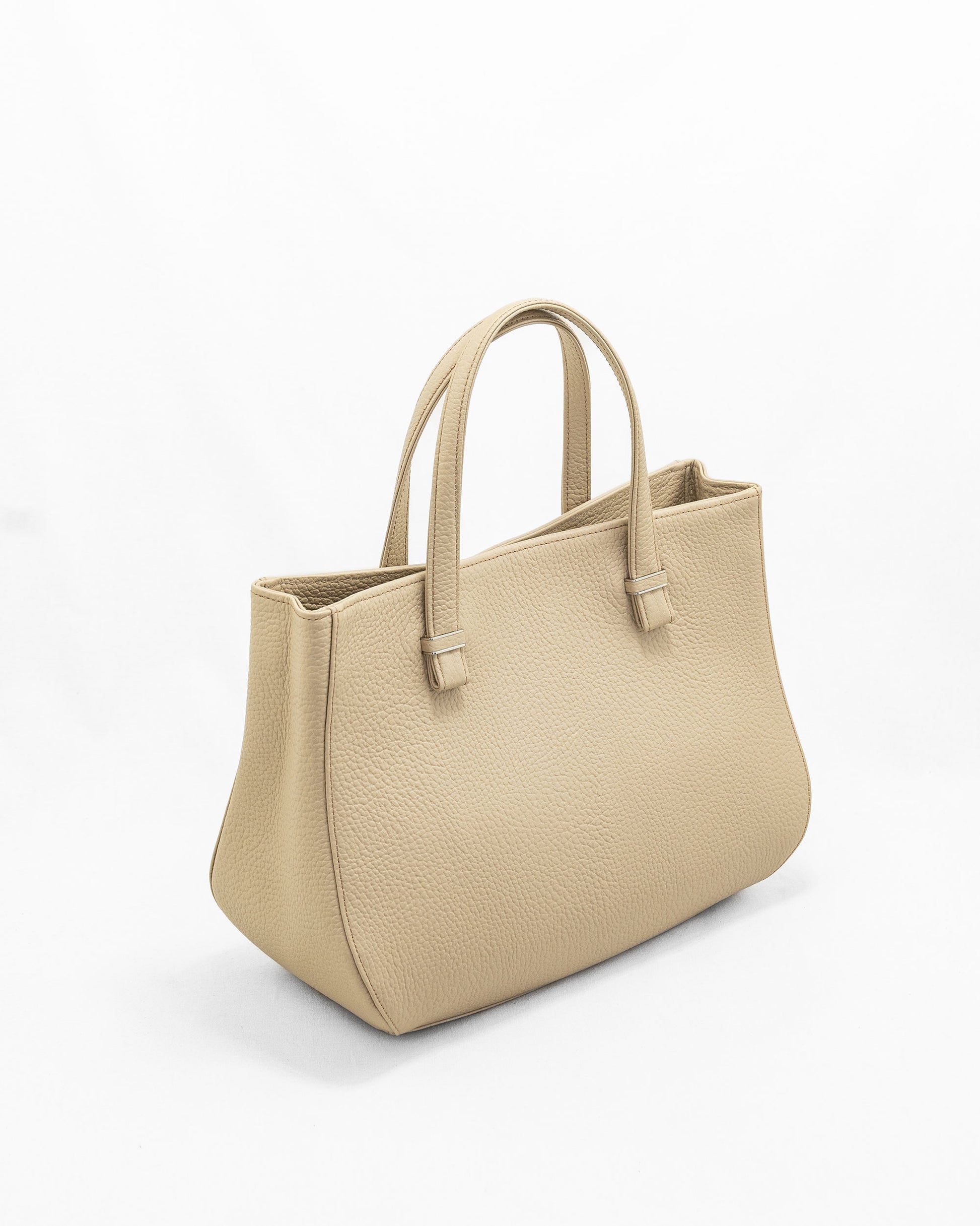 季節や天候に左右されず、通勤など、お仕事やプライベートでもオンオフどちらでも華を添える嬉しいデザイン。B5サイズ、長財布、ポーチなどが収納できるサイズ感で、大きすぎず小さすぎず、丁度良い使い心地。本革は表面に防水加工を施した国産シュリンクレザーで、急な雨に降られても布で拭いておくことでひとまず安心です。