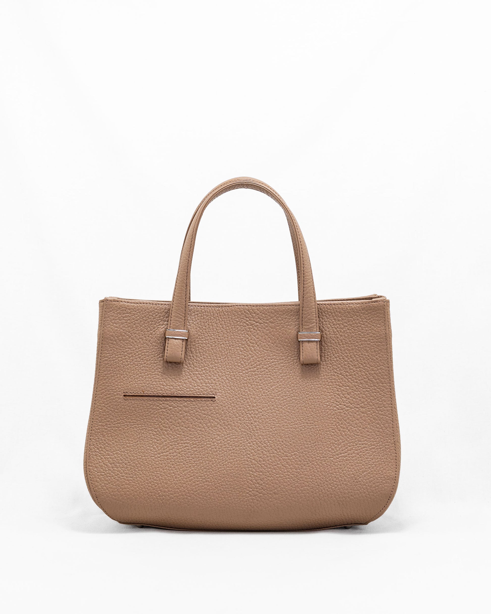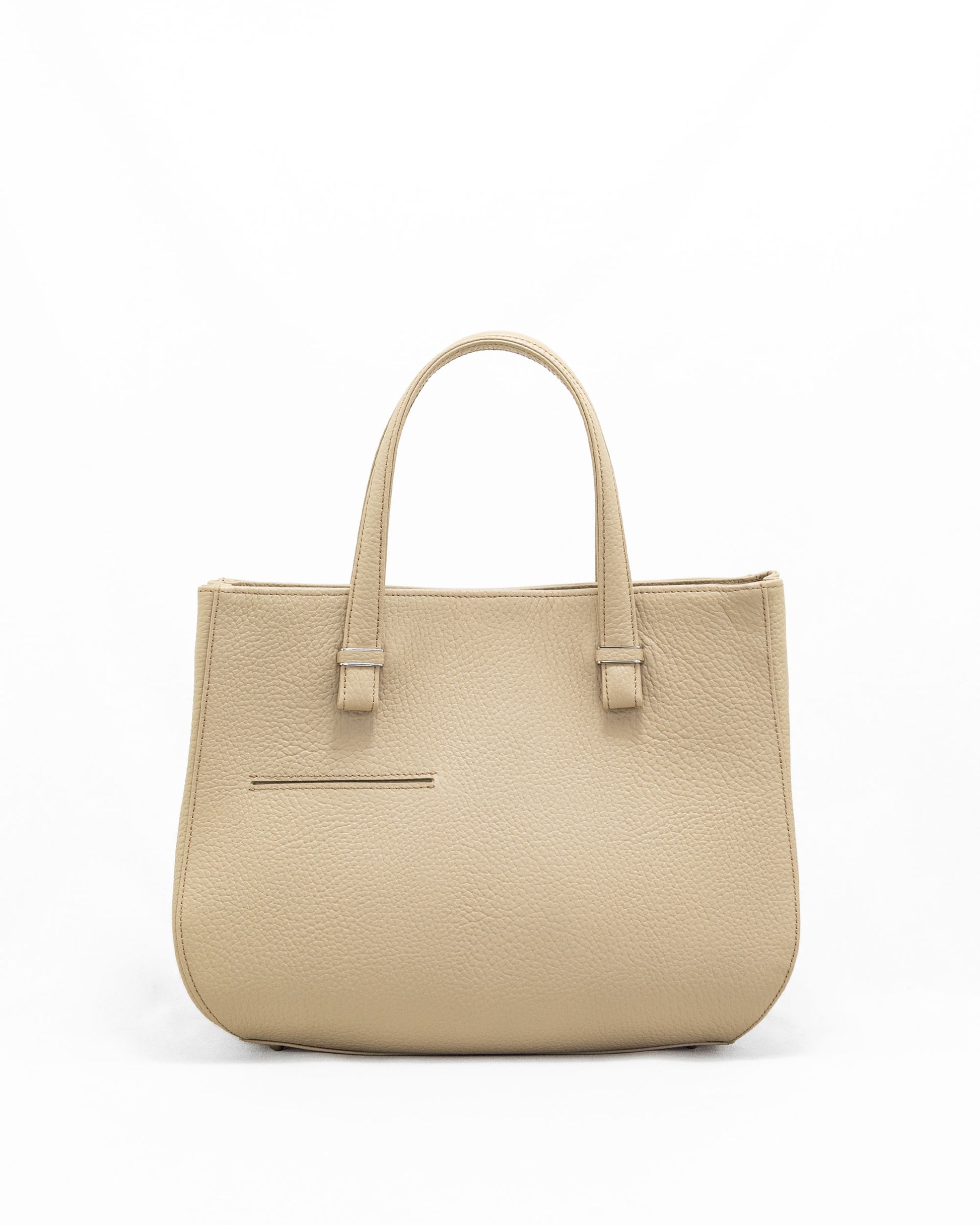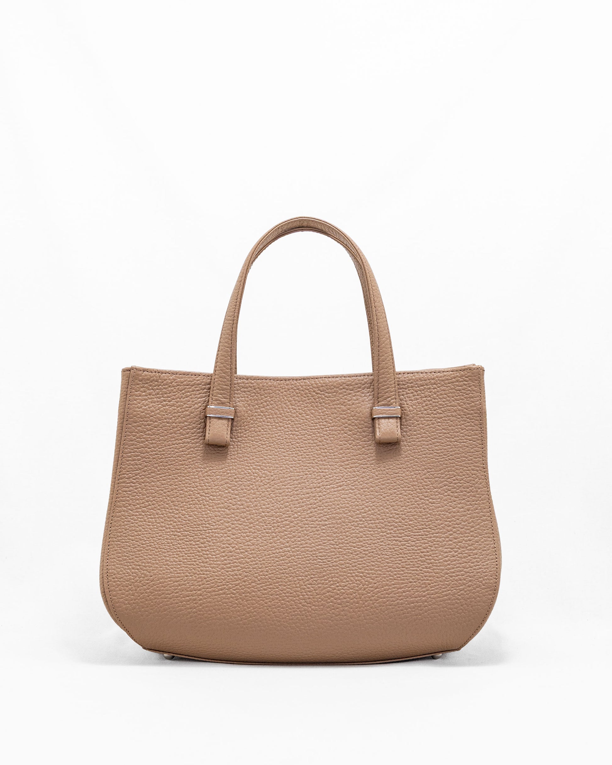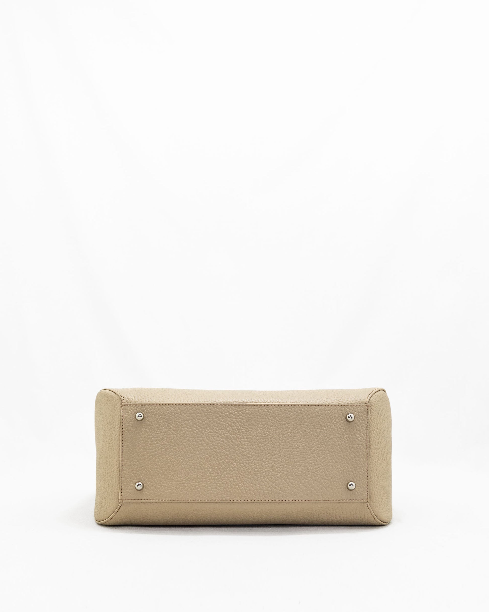 季節や天候に左右されず、通勤など、お仕事やプライベートでもオンオフどちらでも華を添える嬉しいデザイン。B5サイズ、長財布、ポーチなどが収納できるサイズ感で、大きすぎず小さすぎず、丁度良い使い心地。本革は表面に防水加工を施した国産シュリンクレザーで、急な雨に降られても布で拭いておくことでひとまず安心です。