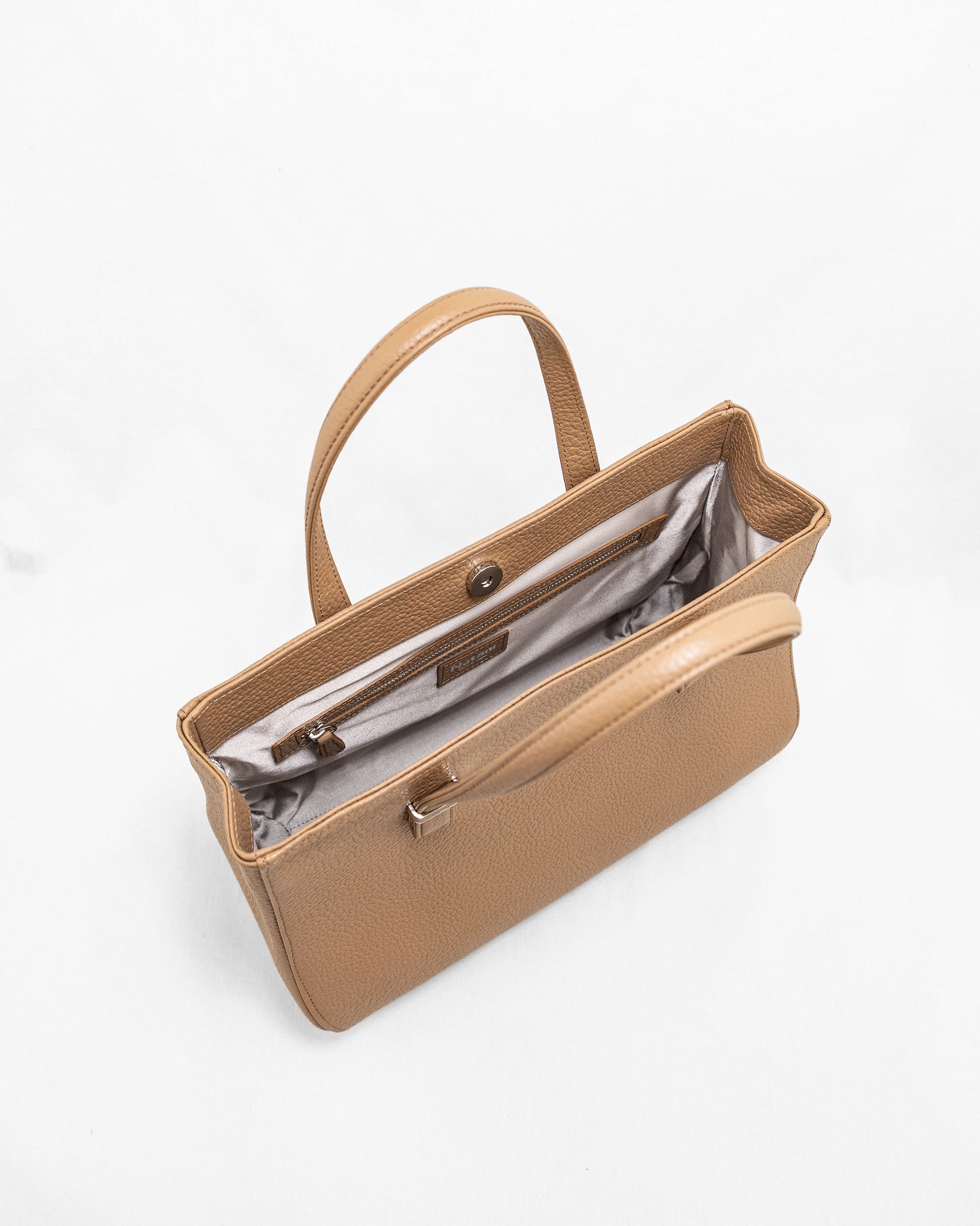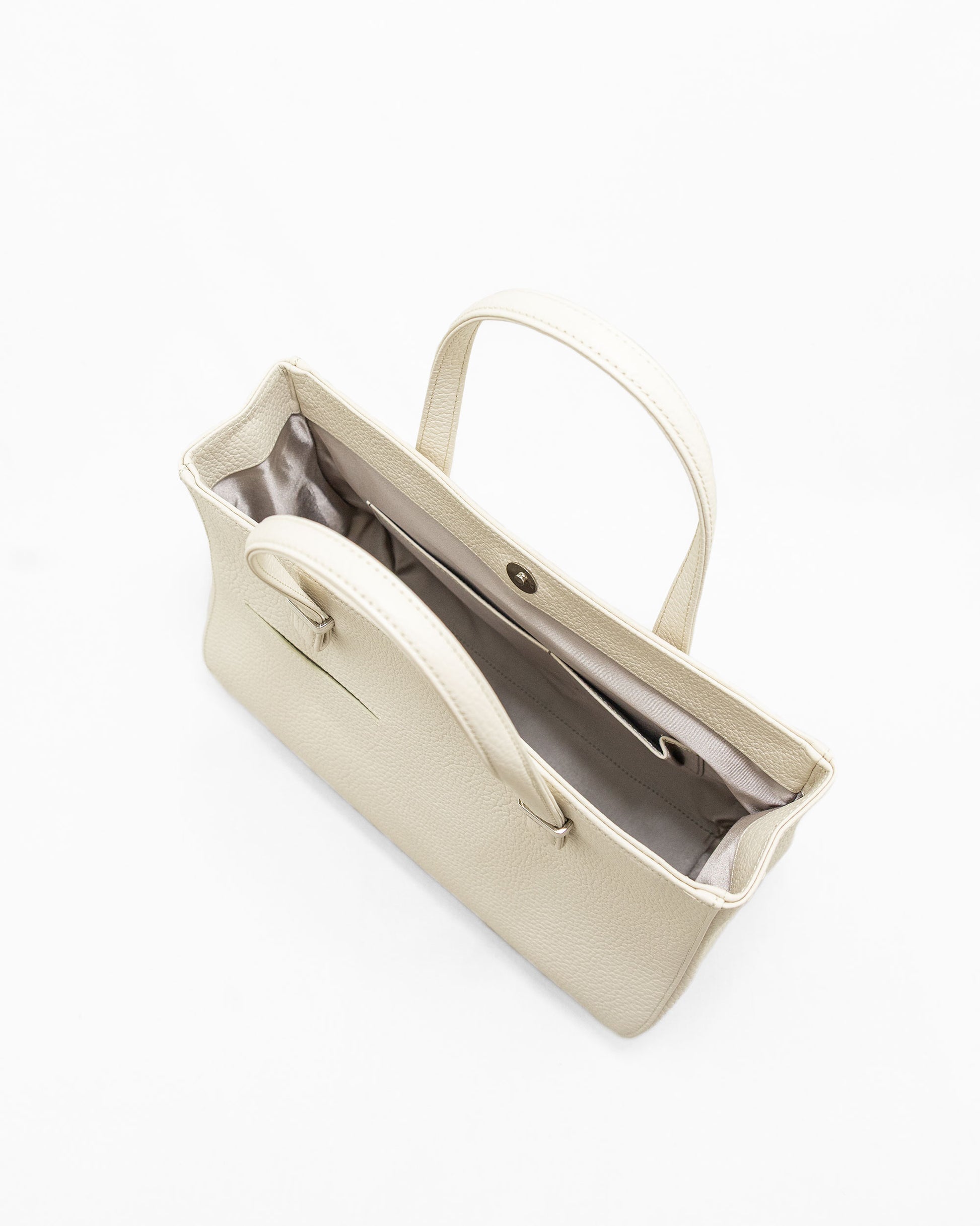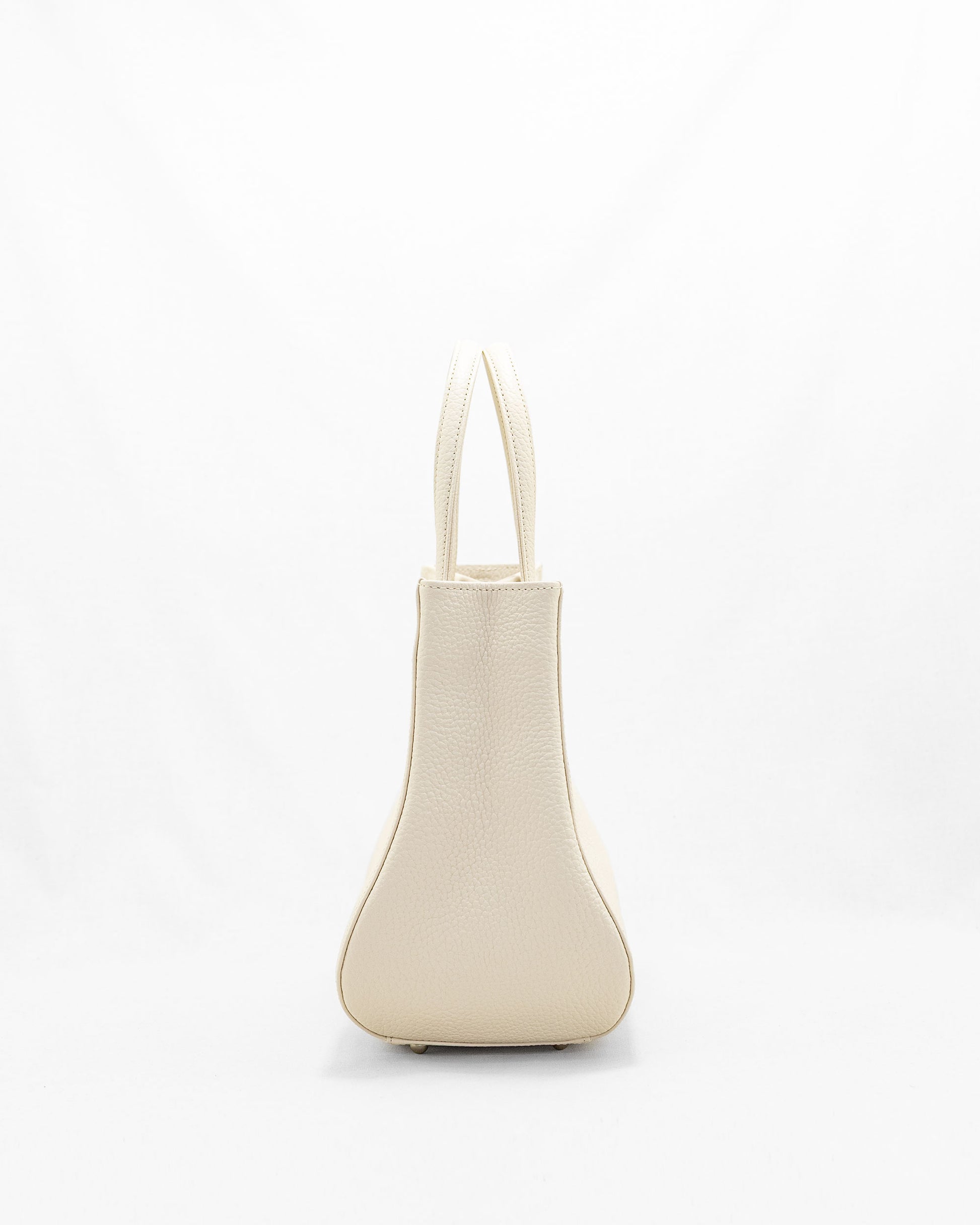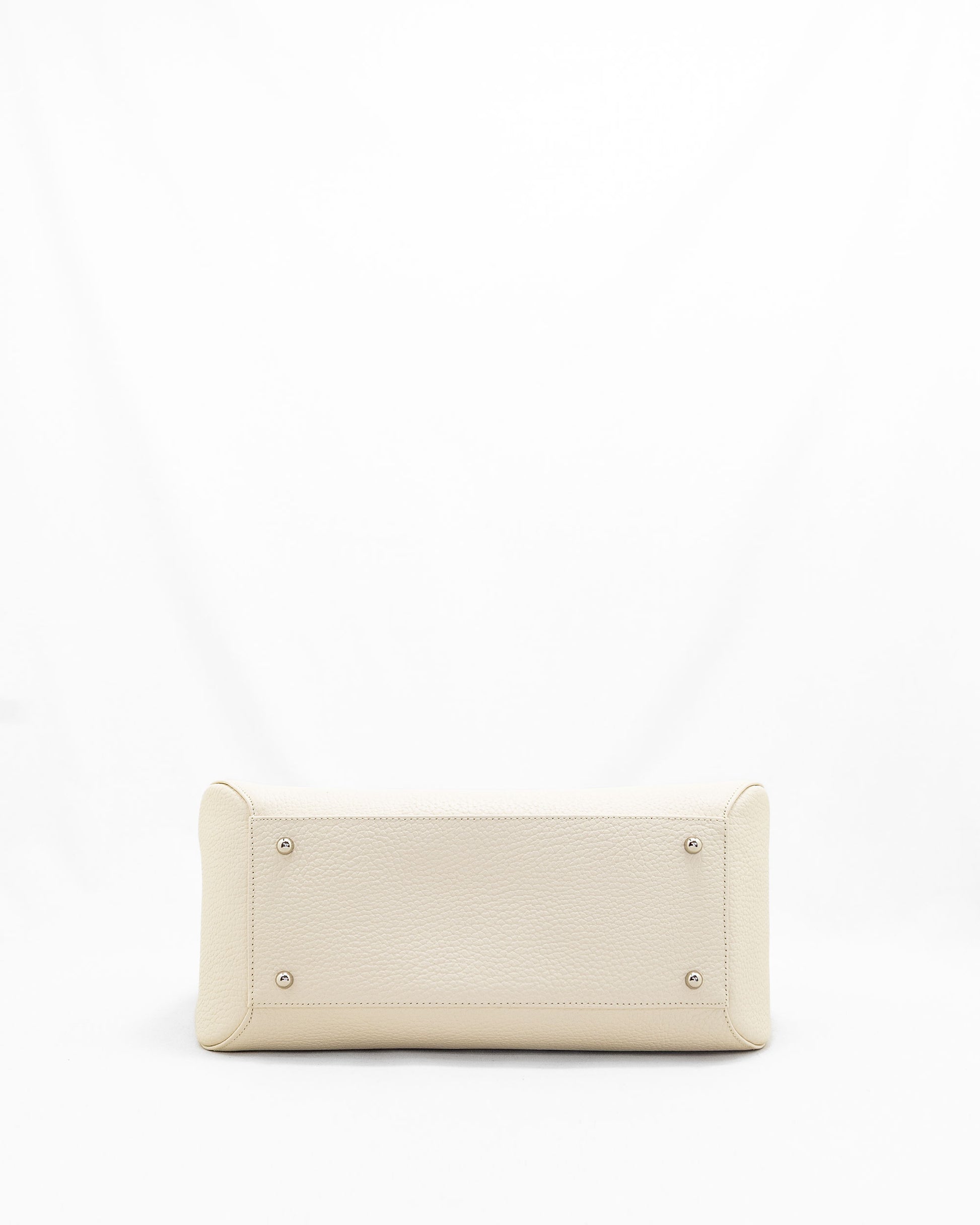 季節や天候に左右されず、通勤など、お仕事やプライベートでもオンオフどちらでも華を添える嬉しいデザイン。B5サイズ、長財布、ポーチなどが収納できるサイズ感で、大きすぎず小さすぎず、丁度良い使い心地。本革は表面に防水加工を施した国産シュリンクレザーで、急な雨に降られても布で拭いておくことでひとまず安心です。