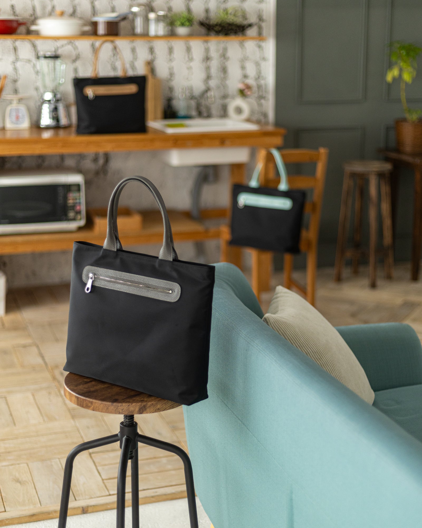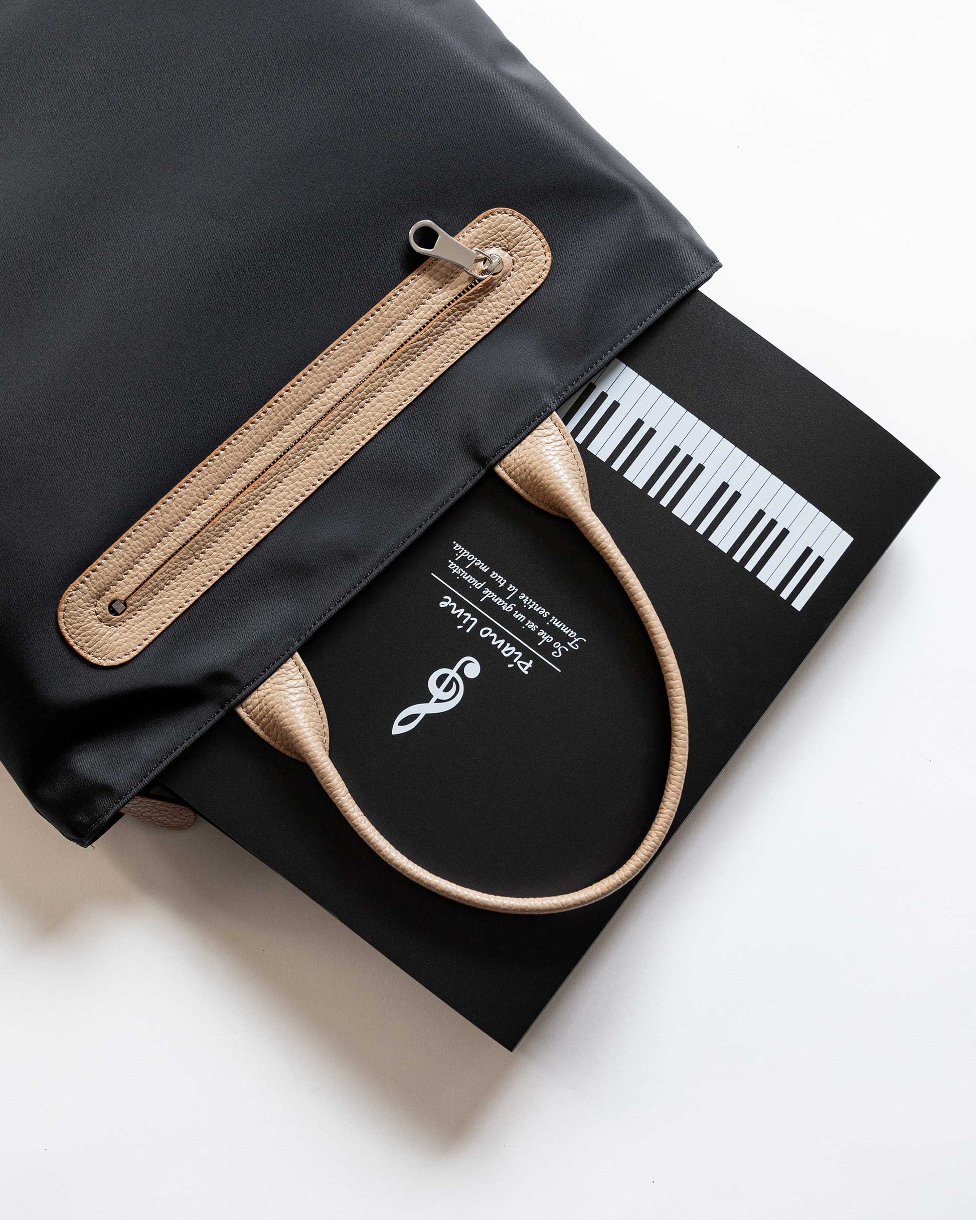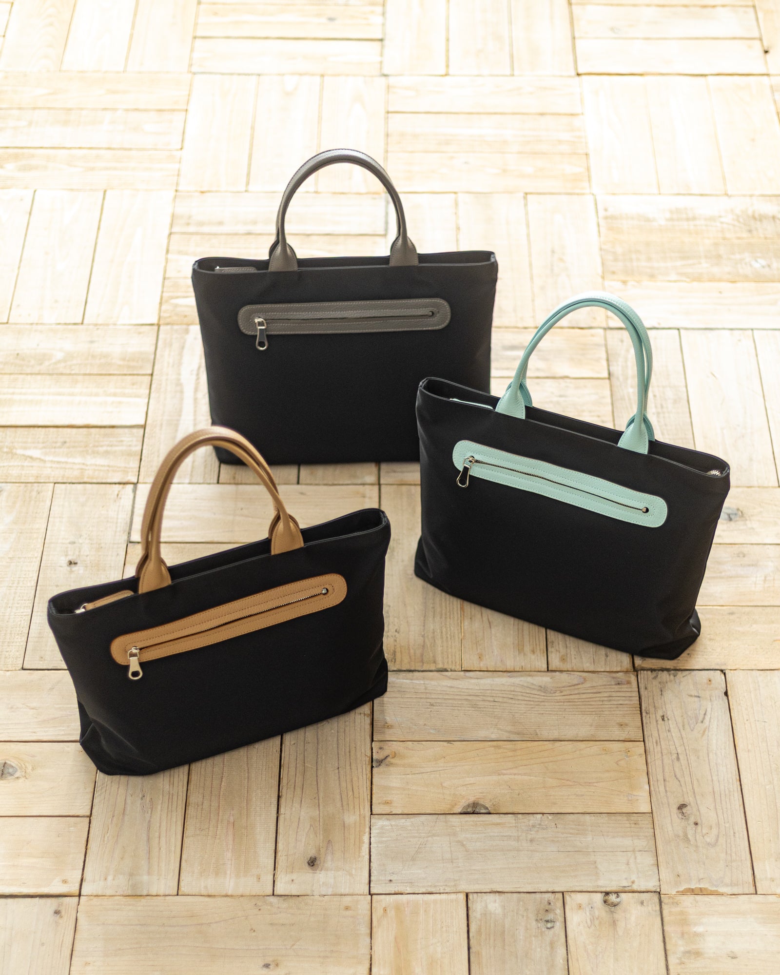 A4サイズの楽譜や教科書などが楽に収納できて、学校やお稽古ごとに役立つレッスンバッグが登場。ナイロン100%の素材とイタリア製シュリンク型押しレザーで500gの軽さ。フロントと内側にファスナーポケットと、オープンポケットが2つあるので散らかることなく整理でき、モノの出し入れも楽。サブバッグとしても魅力のレッスンバッグです。